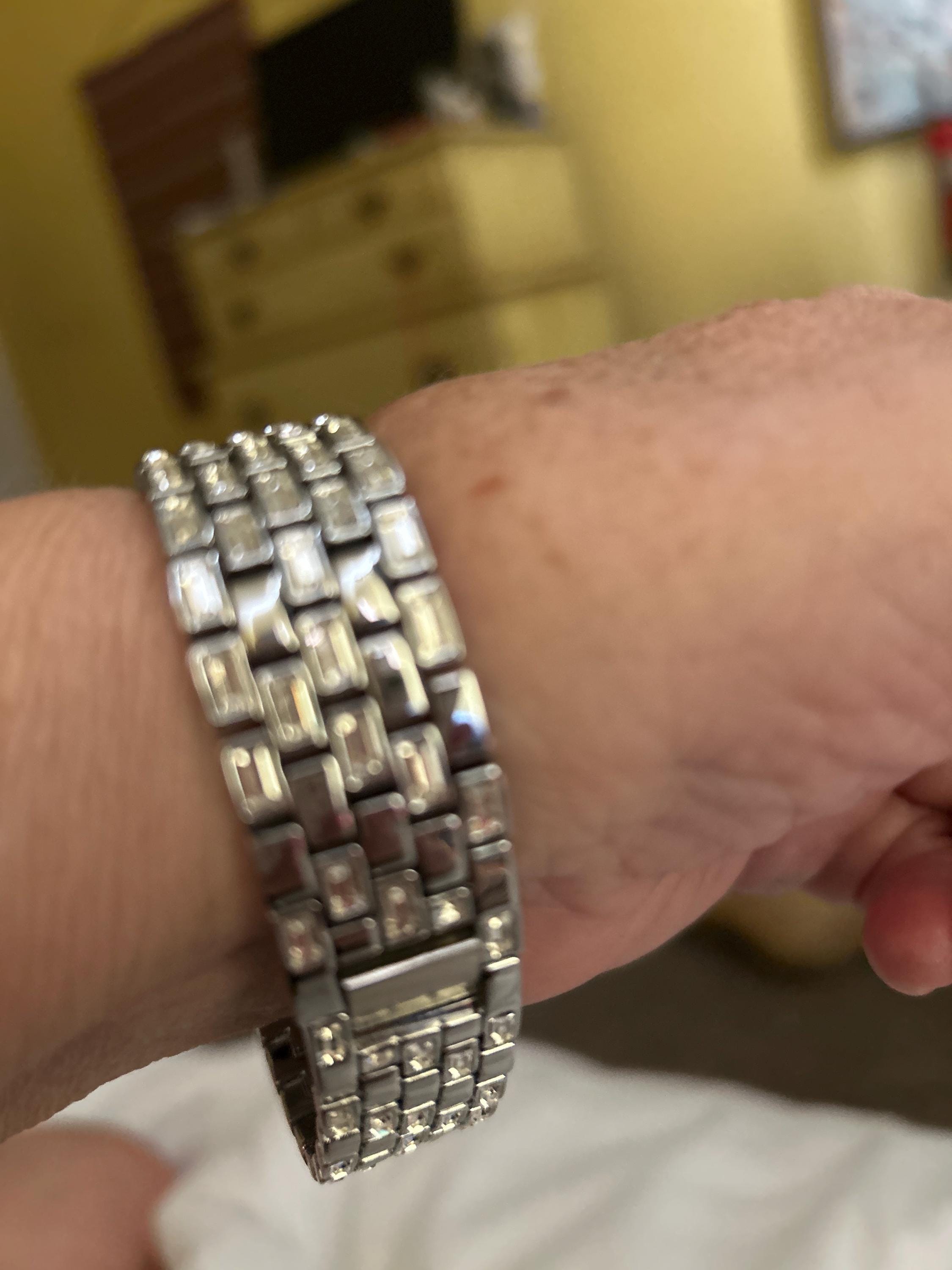 Introducing our Custom Handcrafted Silver Apple Watch Band, adorned with stunning High Quality Swarovski Crystals Baguette stones, available in sizes 38mm, 40mm, 41mm, 42mm, 44mm, 45mm and 46mm . This band is a one-of-a-kind design, specifically made to fit the Apple Watch. Please note that it is not a brand copy. Our high-quality silver alloy plated band is sure to make a statement with its rows of dazzling Swarovski Crystal baguette stones.