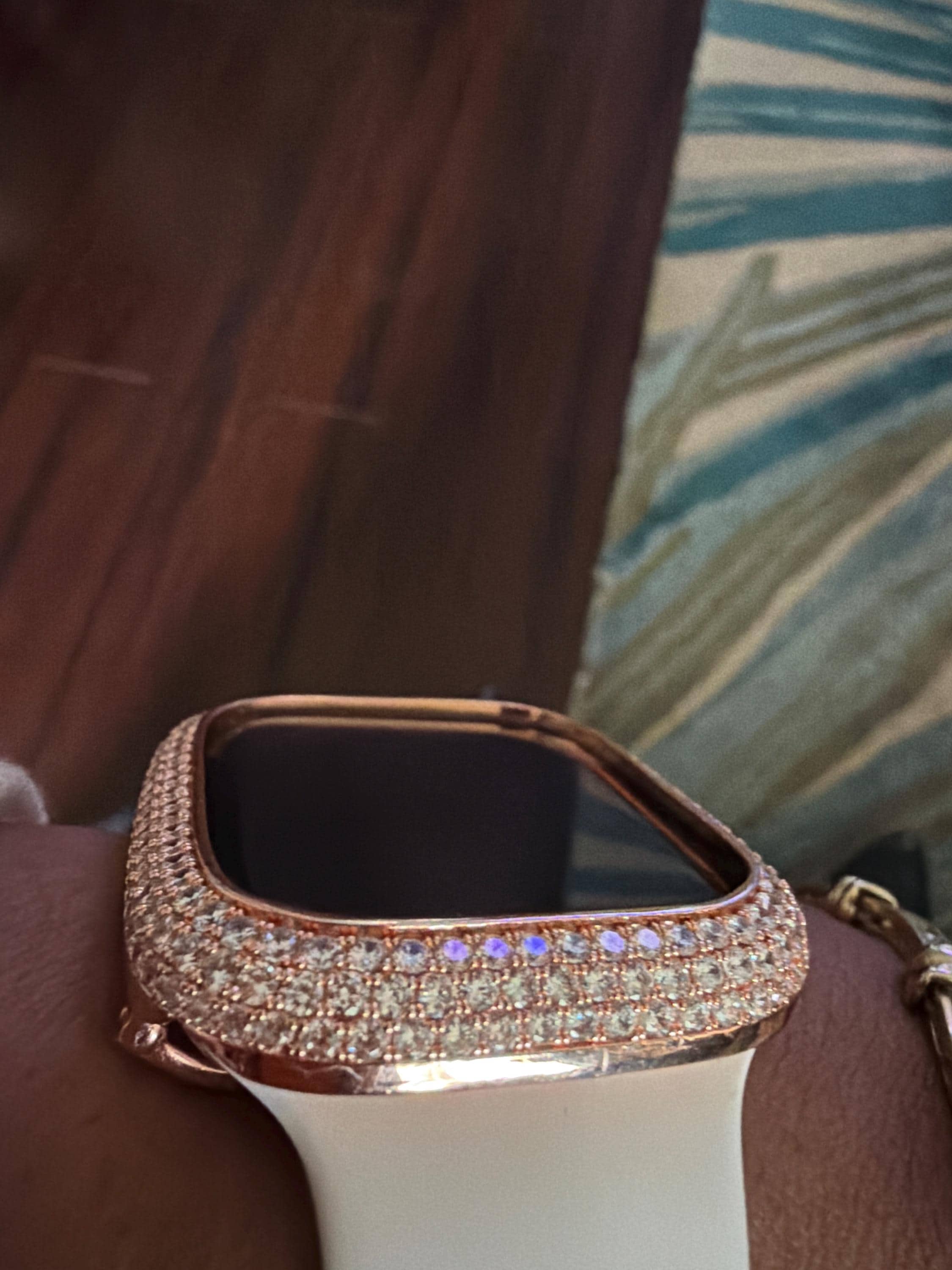 Apple Watch Case Materials: 14kt Rose gold plating over a metal base with hand set pave lab created diamonds. Two bars on the back hold the Apple Watch in place with access to all buttons. There is NO screen protector. Instructions Included.