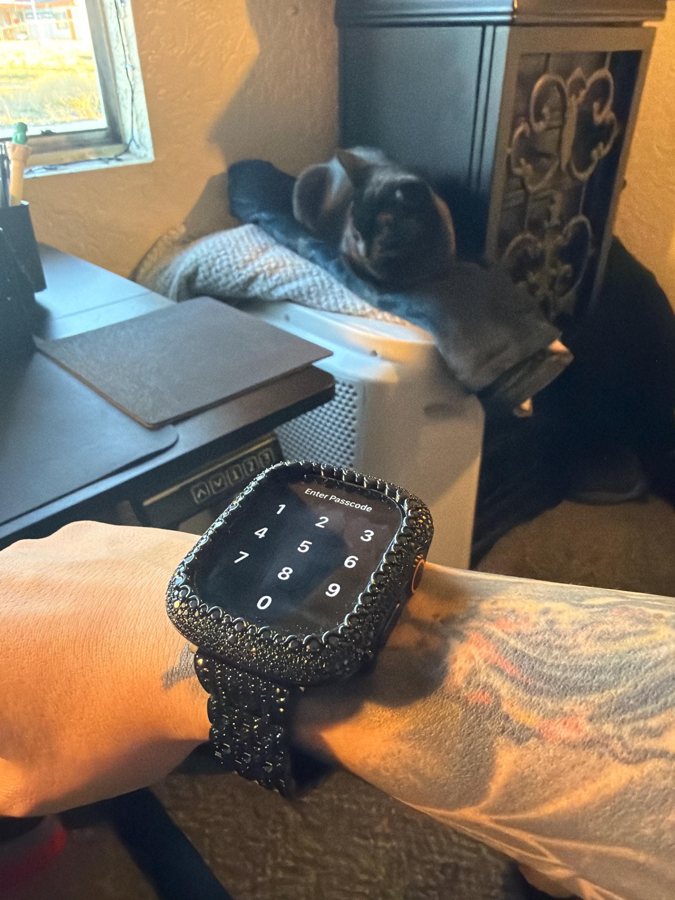 Our Jeweled Watch Band is adjustable and comes with a link removal tool and instructions, making it easy to find the perfect fit for wrist sizes 5.5" to 8". You can also choose a different style from our Bezel section for a personalized touch. The Apple Watch Cover features Black Pave lab diamonds set in 14k Black Rhodium Plated Metal for long-lasting wear and luster. The two bars on the back of the bezel hold it securely in place, with one bar that opens to slide the watch in. There is no screen protector. Please note that this band does not fit the all-ceramic Apple Watch.
