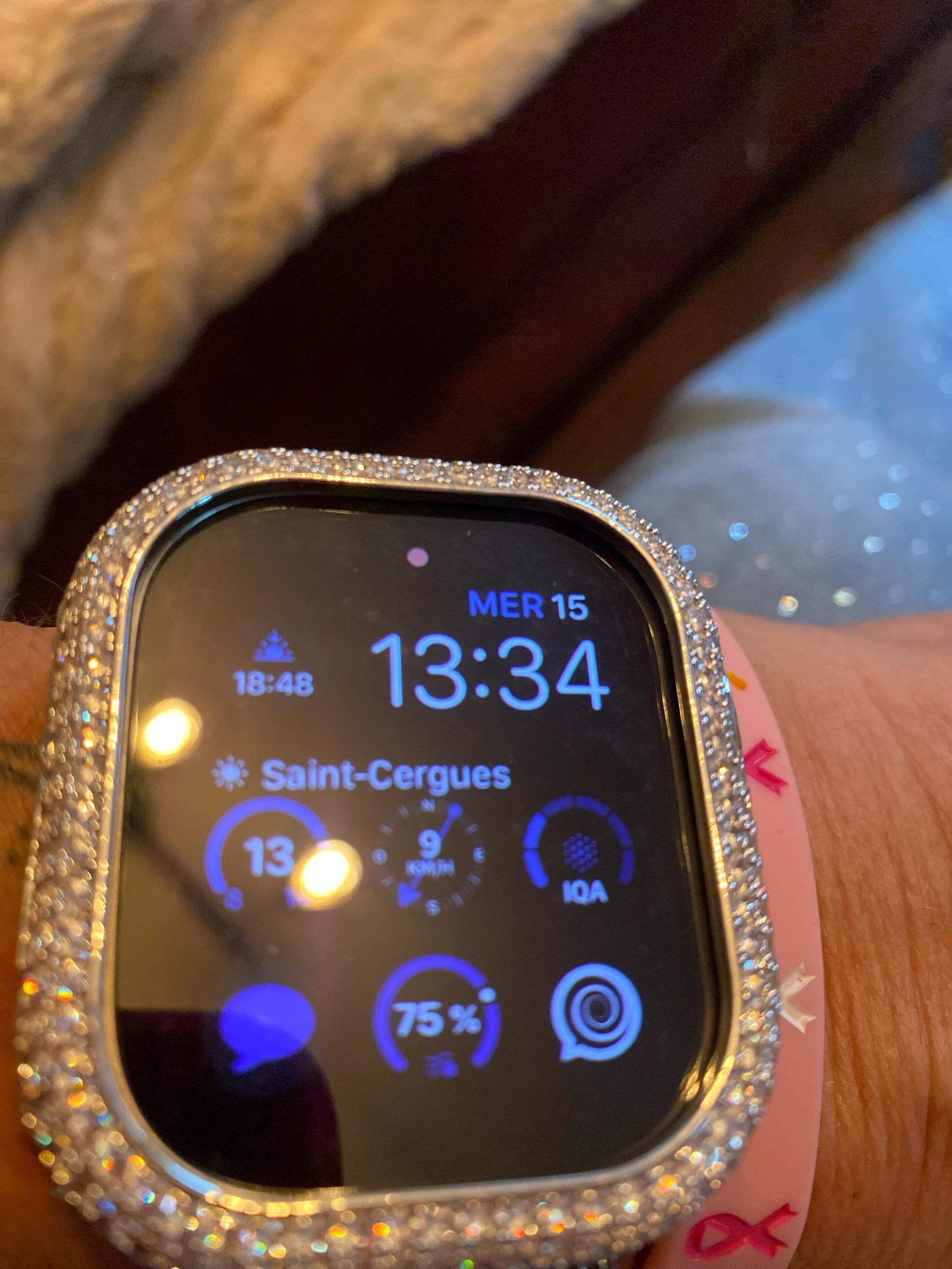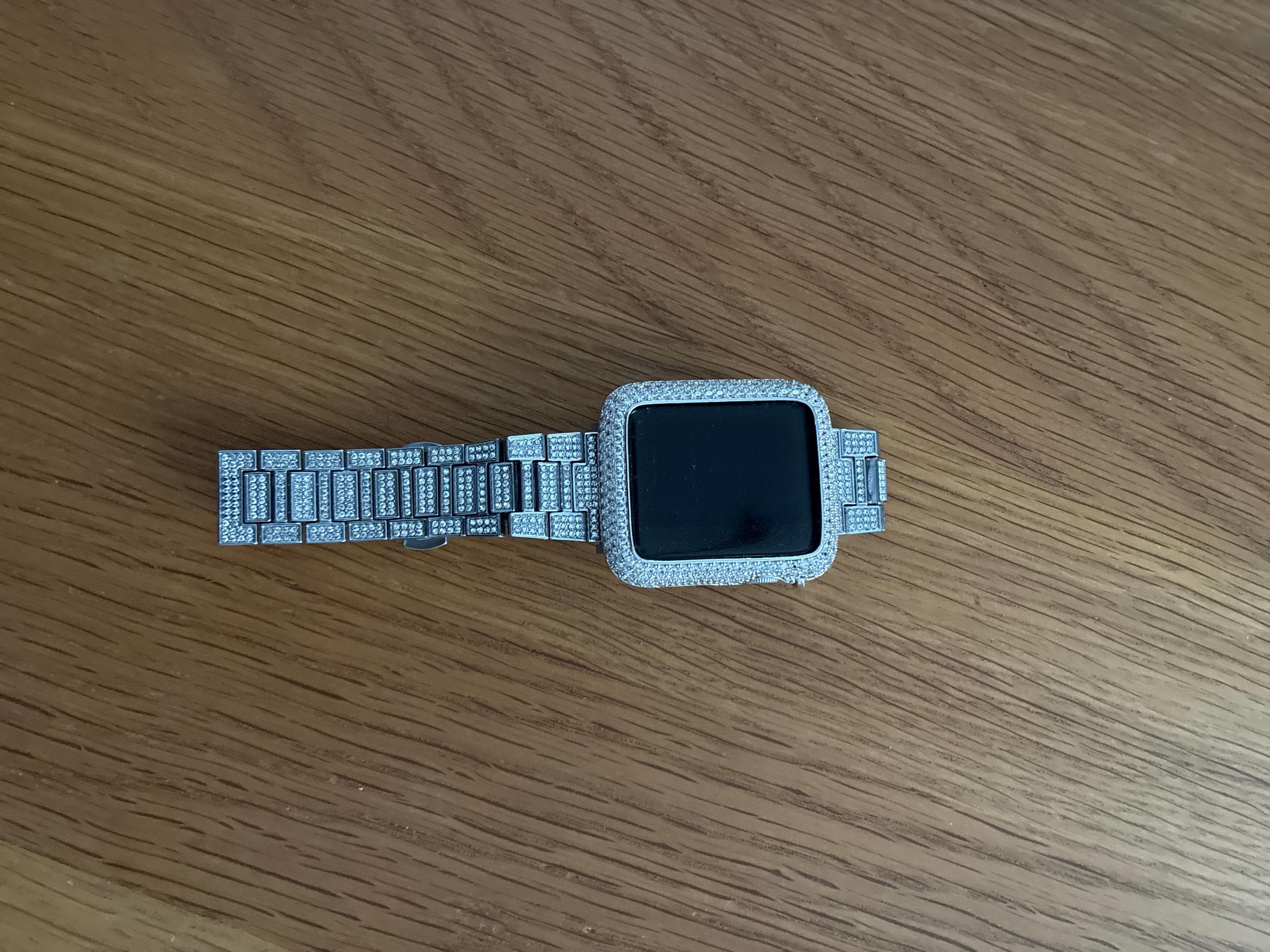 For the ultimate in sparkle, add the Silver Apple Watch Case in 14K White Gold Plated Metal with hand set high quality Pave Lab Diamonds. This apple watch cover has two bars on the back to hold the apple watch in place with access to all buttons, no screen protector.