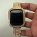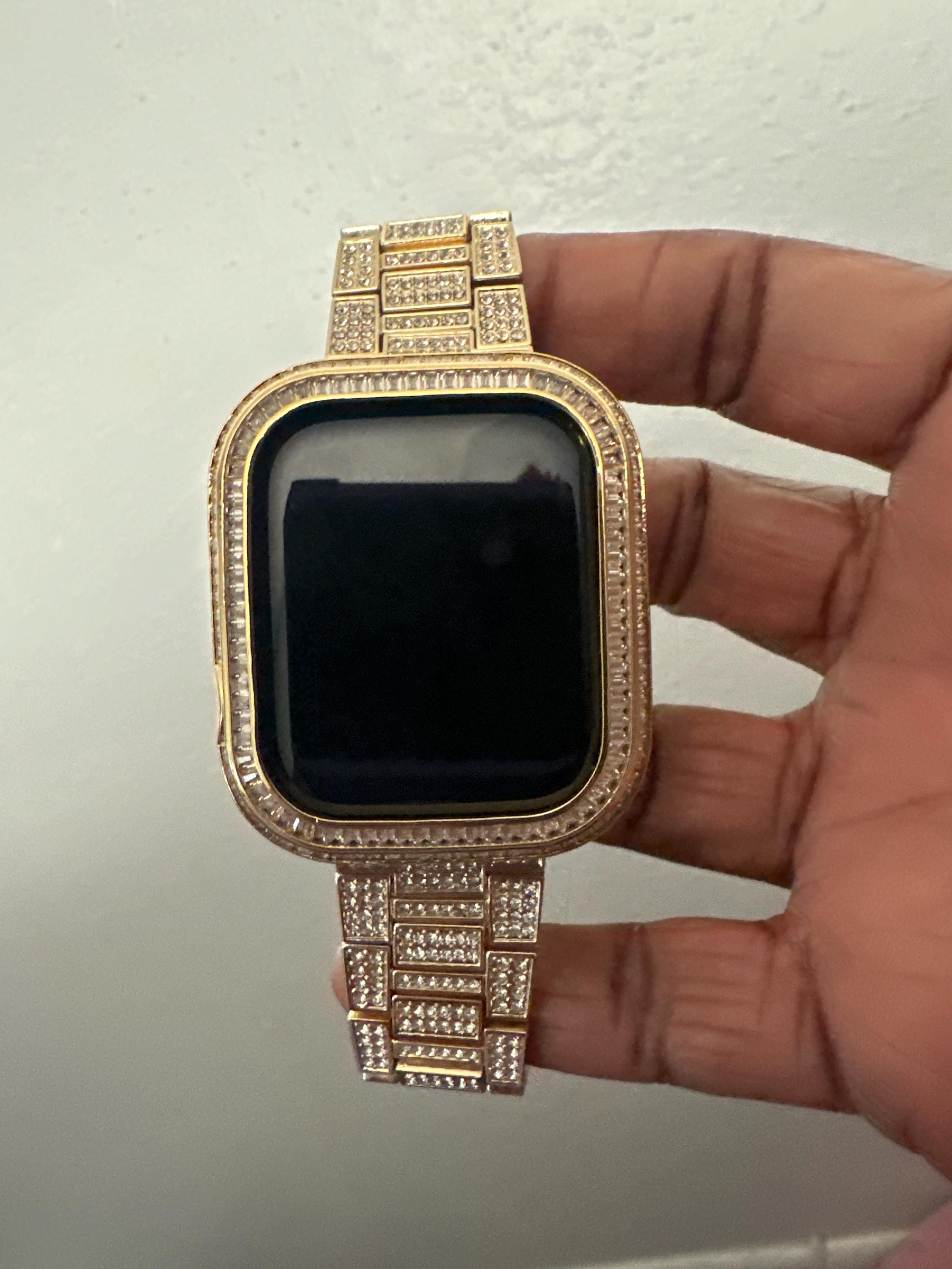 Luxury Apple Watch Band Yellow Gold Pave High End Crystals & or Apple Watch Case Lab Diamond Bezel Cover Smartwatch Bumper Bling from Iwatch Candy. Fits the Apple Watch available for sizes 40mm 41mm 44mm 45mm Series 4,5,6,7,8,9 SE Men's & Women's. This is a custom design made to fit the Apple Watch, it is not a brand copy. This beautiful Apple Watch Band is high on bling with a yellow gold stainless steel band with pave High End Swarovski Crystals with a butterfly buckle style closure. This apple watch band can be resized to fit wrist size 5.75" to 8". Comes with resizing tool and instructions.
