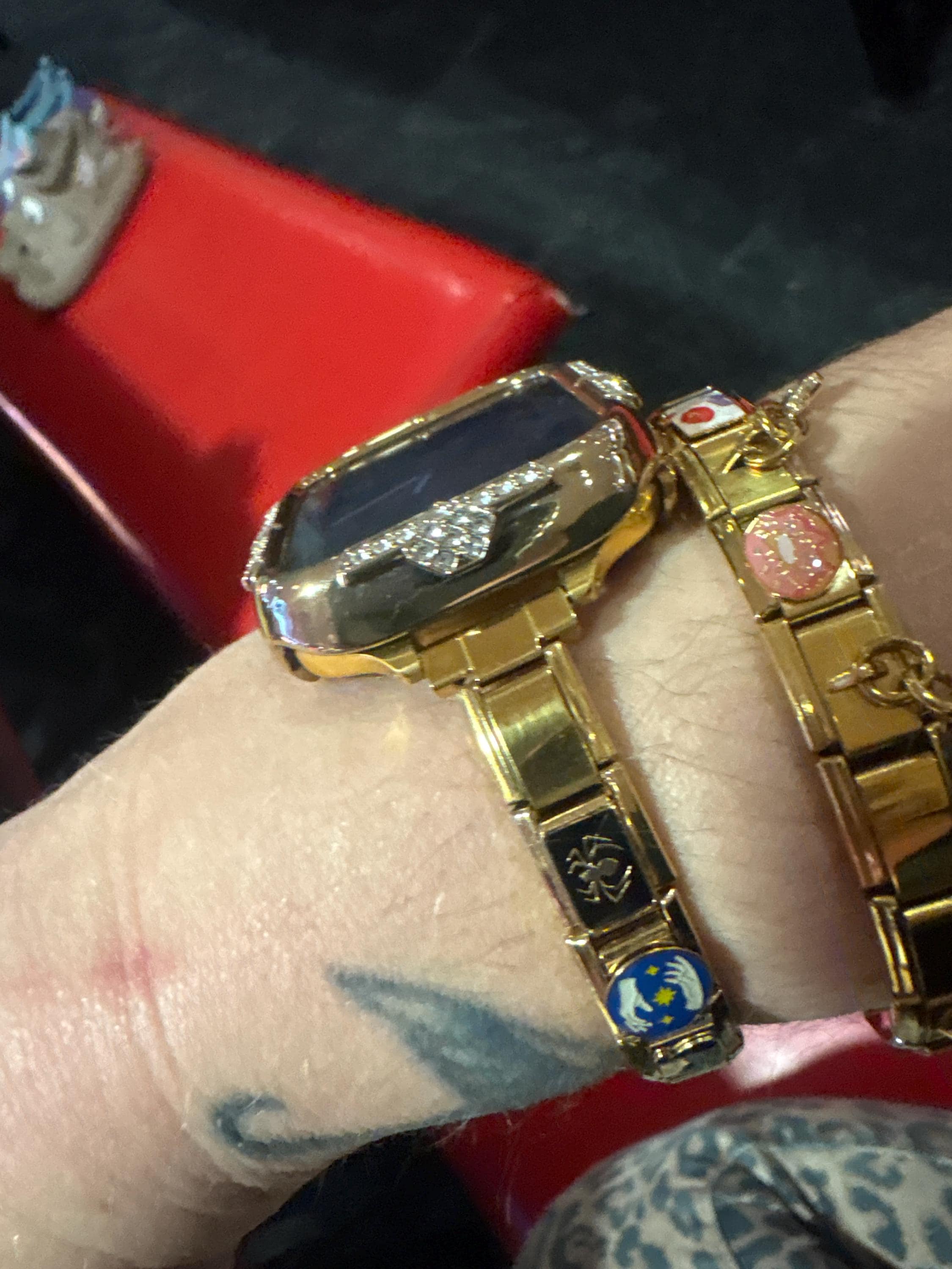 Materials: Swarovski Crystals apple case, poly carbonate frame apple case, 14k gold plating apple band or case.
