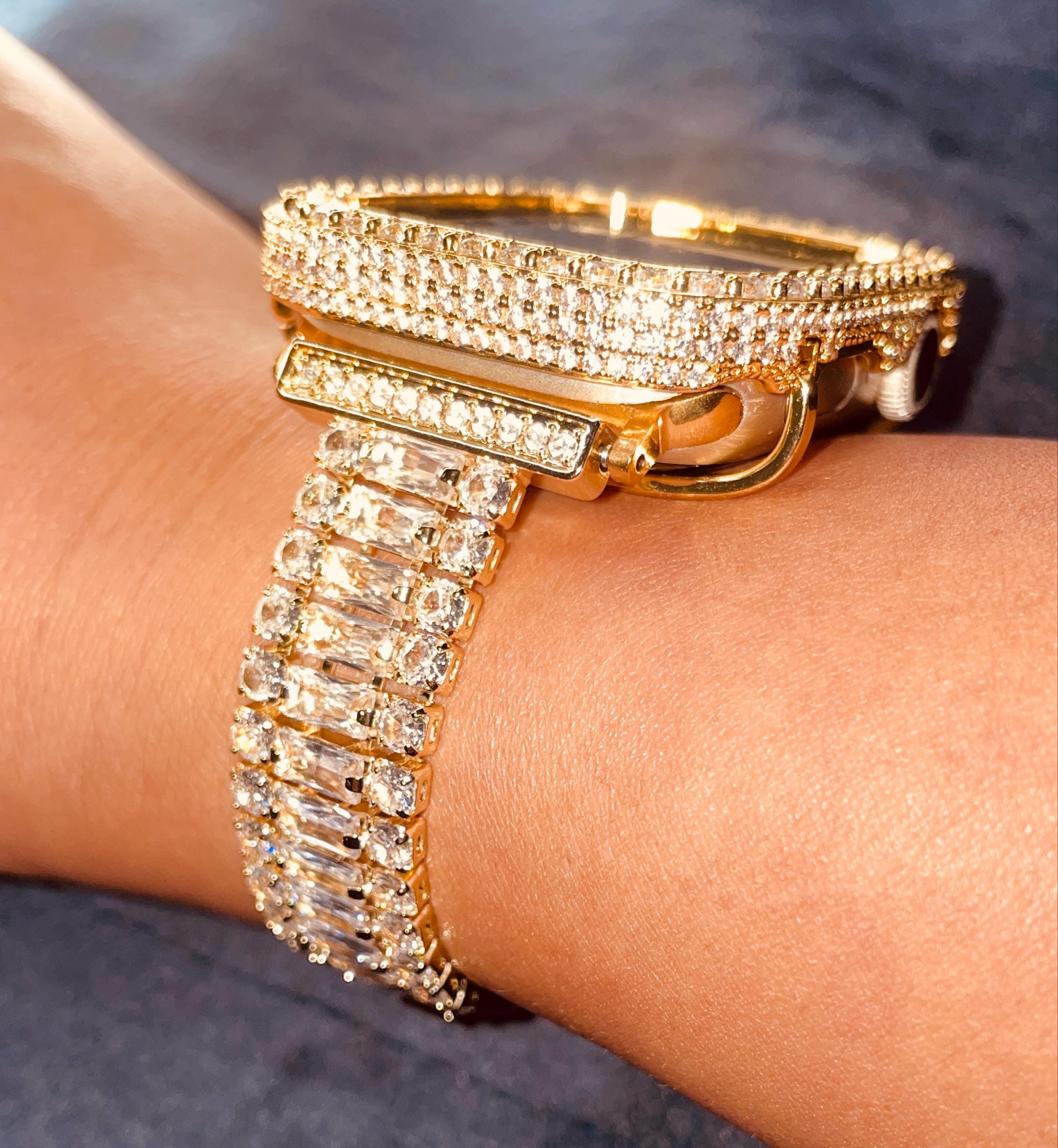 Apple Watch Case Materials: 14kt gold plating over a metal base with pave and 2.5mm lab created diamonds. Two bars on the back hold the Apple Watch in place with access to all buttons. There is NO screen protector. Instructions Included.