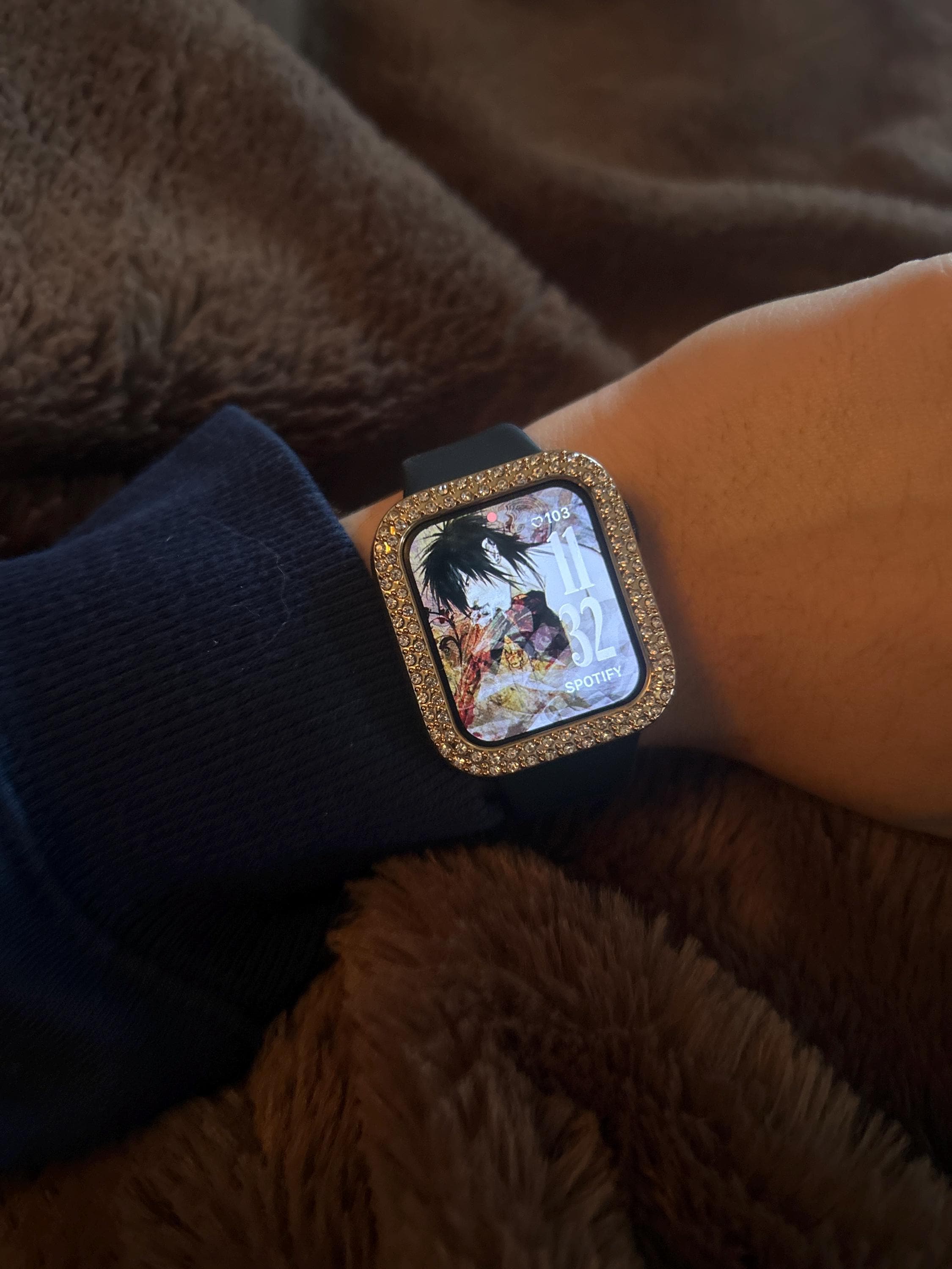 Fits the Apple Watch Sizes 38mm 40mm 41mm 42mm 44mm 45mm 46mm 49mm Ultra 1/2/3 Series 2-11 SE. This Apple Watch Case Cover features 2 rows of sparkling Swarovski Crystals set in a polished gold metallic poly carbonate hard frame. This hard frame resists scratches, wear and tear. Easy snap on style with access to all buttons. There is no plastic screen and it is not made of metal. Photos and video are of a 49mm side buttons will vary based on size and series of watch. There is no band in this listing, bezel only.