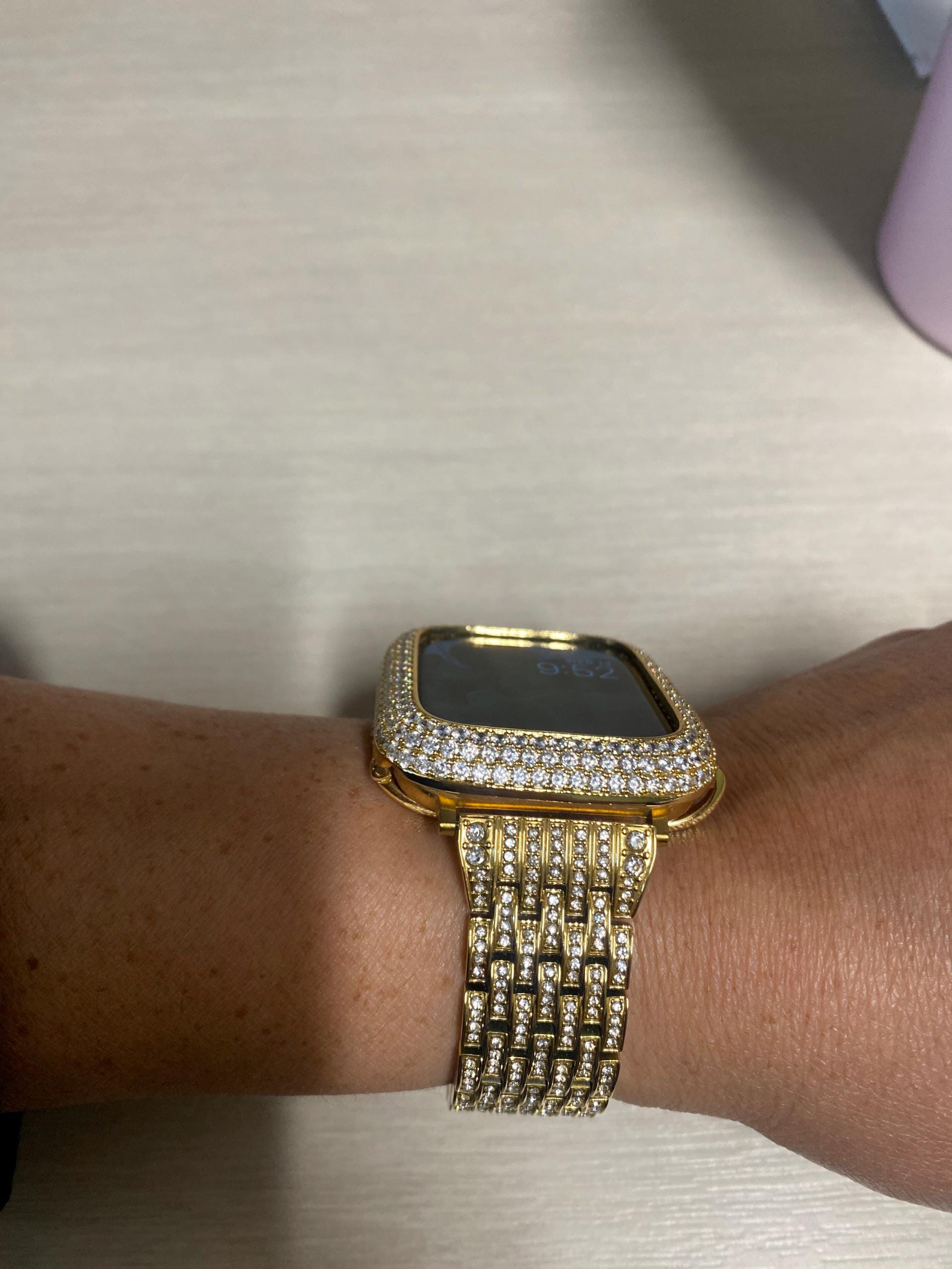Apple Watch Case Materials: 14kt yellow gold plating over a metal base with hand set pave lab created diamonds. Two bars on the back hold the Apple Watch in place with access to all buttons. There is NO screen protector. Instructions Included.