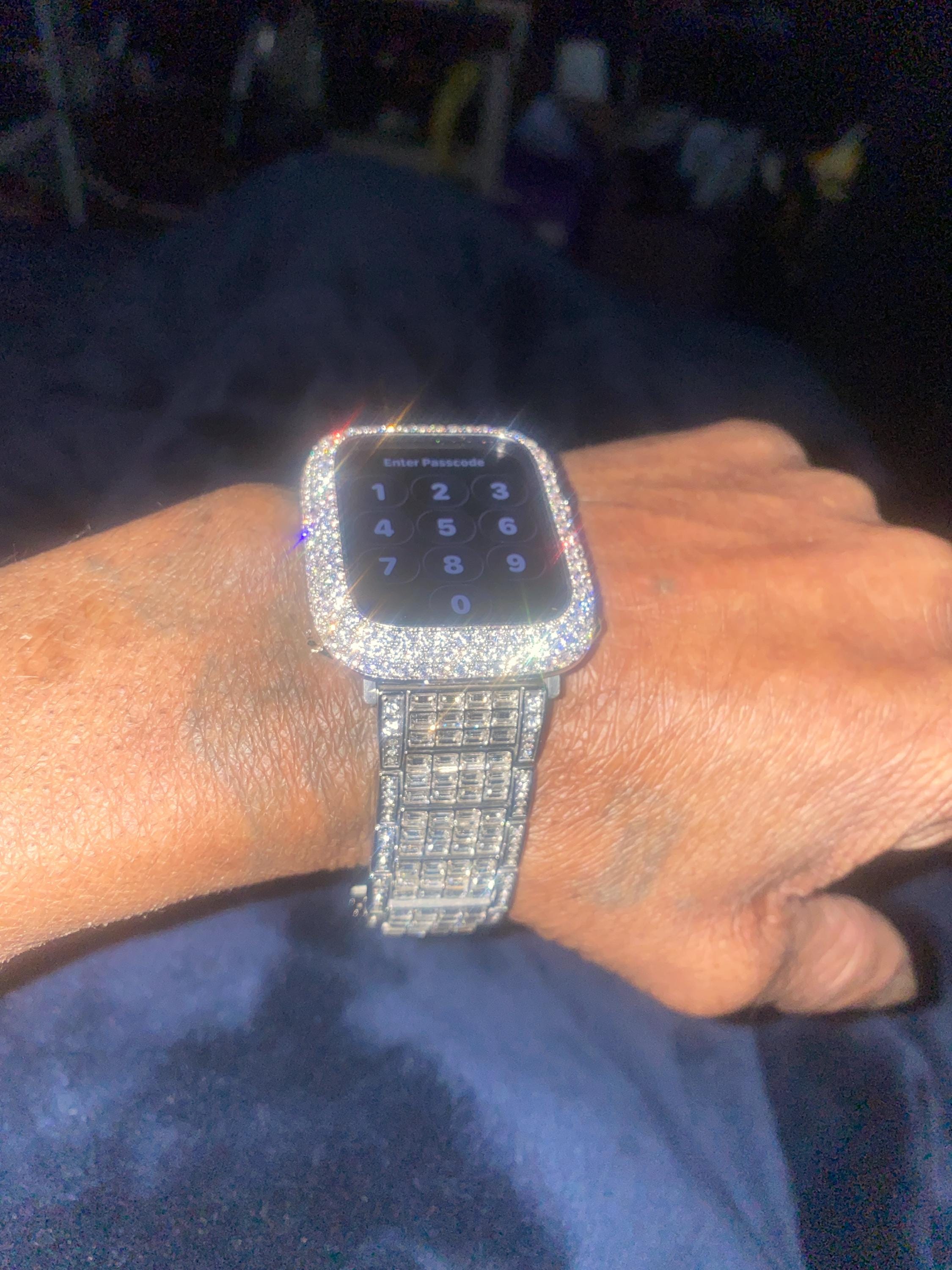 For the ultimate in sparkle, add the 14k White Gold Plated pave lab diamond apple watch case.