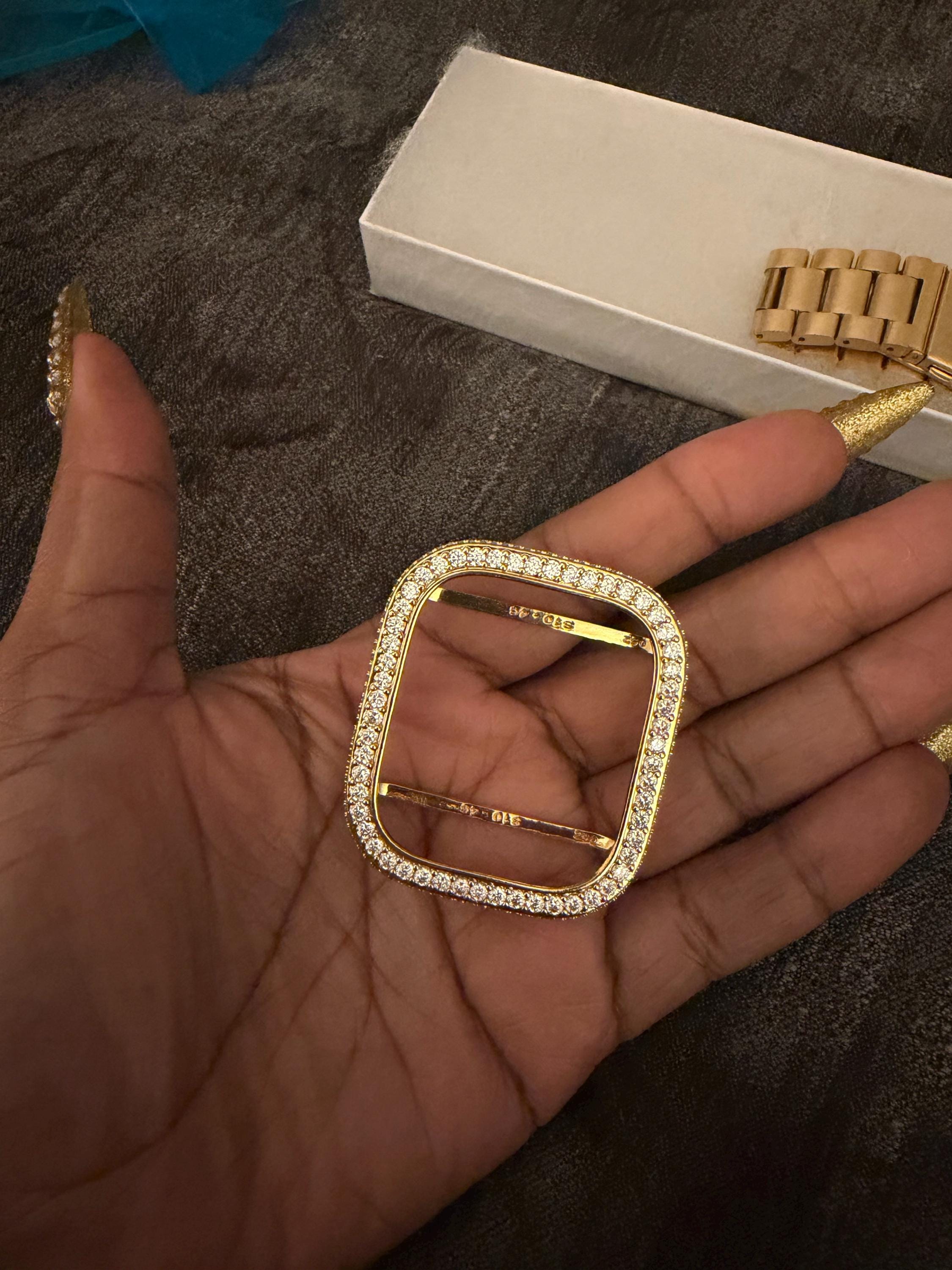 Pair it with an iced Out Gold Apple Bezel 14k gold plated Metal style case cover with Large 2.5mm lab diamonds around the face and micro pave lab diamonds on the sides. Huge Sparkle and Bling. Photos just don't do this bezel justice...mega sparkle.