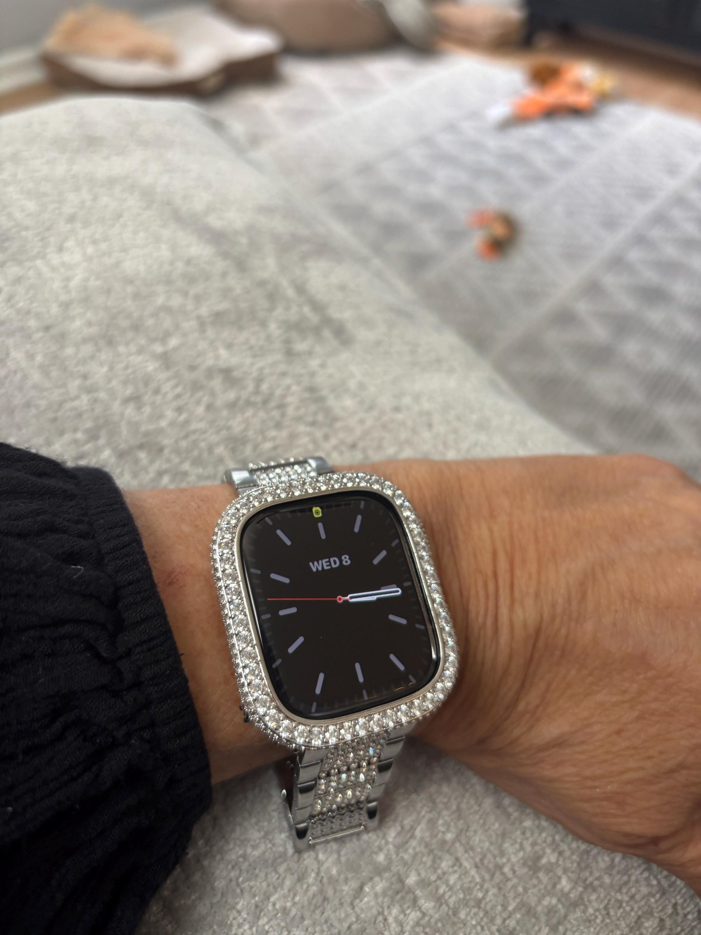 Fits the Apple Watch available for sizes 38mm 40mm 41mm 42mm 44mm 45mm 46mm Series 2-11 SE Ultra 1/2/3 Men's & Women's. This is a custom design made to fit the Apple Watch, it is not a brand copy. Luxury Silver Apple Watch Band Women Fashion Design. Large Hand Set 3mm High End Swarovski Crystals & or 14K Gold Plated Case Cover Bezel Pave lab diamonds. Hand-made plated rhinestone, Large 3mm round cut High End Crystals with a super bling effect in a Custom Zinc Plated Alloy for extra shine and durability.