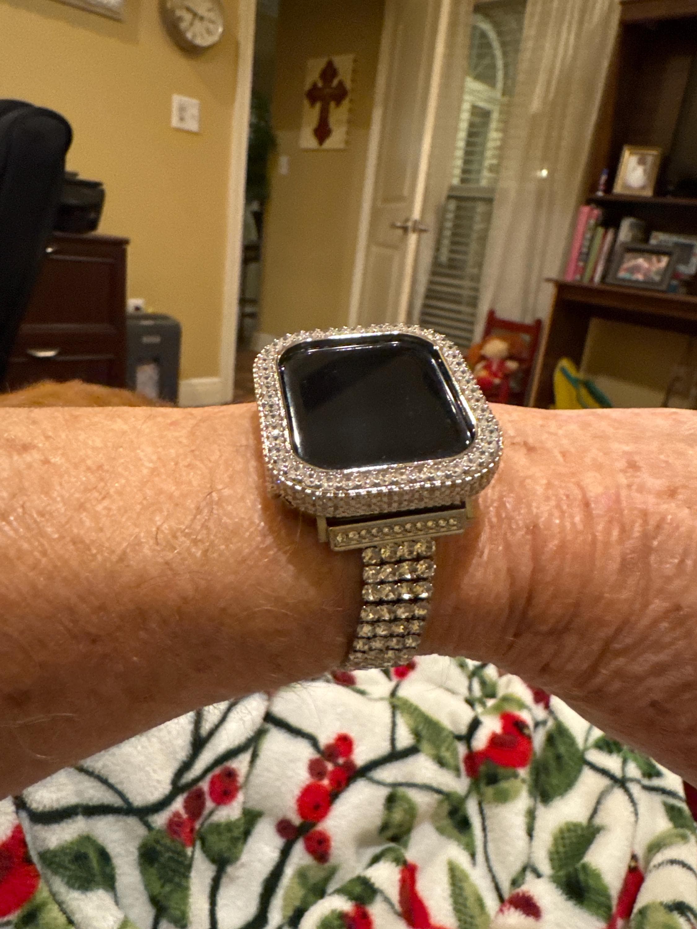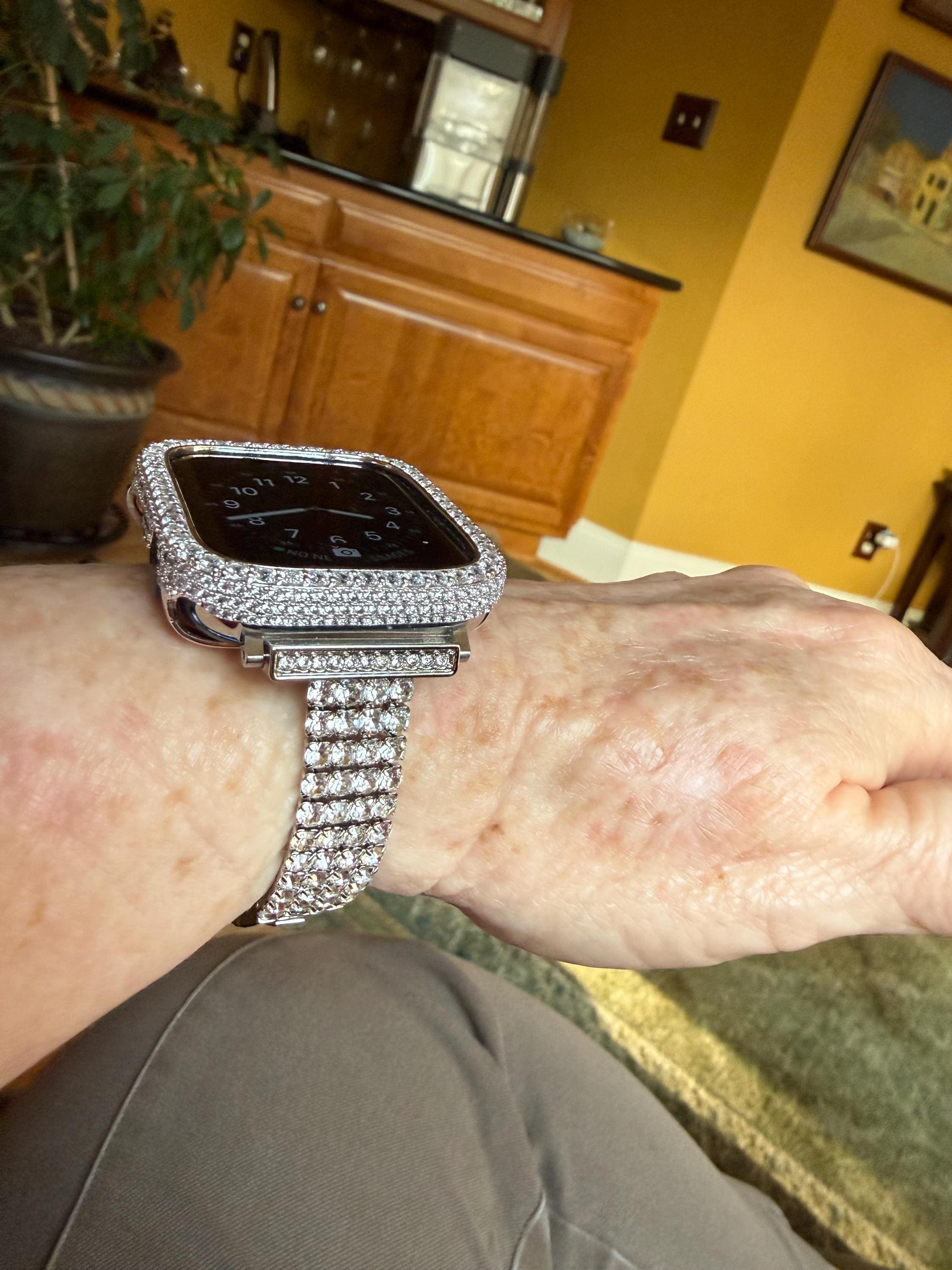 Fits the Apple Watch available for sizes 38mm 40mm 41mm 42mm 44mm 45mm 46mm Series 2-11 SE Ultra 1/2/3 Men's & Women's. This is a custom design made to fit the Apple Watch, it is not a brand copy. Luxury Silver Apple Watch Band Women Fashion Design. Large Hand Set 3mm High End Swarovski Crystals & or 14K Gold Plated Case Cover Bezel Pave lab diamonds. Hand-made plated rhinestone, Large 3mm round cut High End Crystals with a super bling effect in a Custom Zinc Plated Alloy for extra shine and durability.