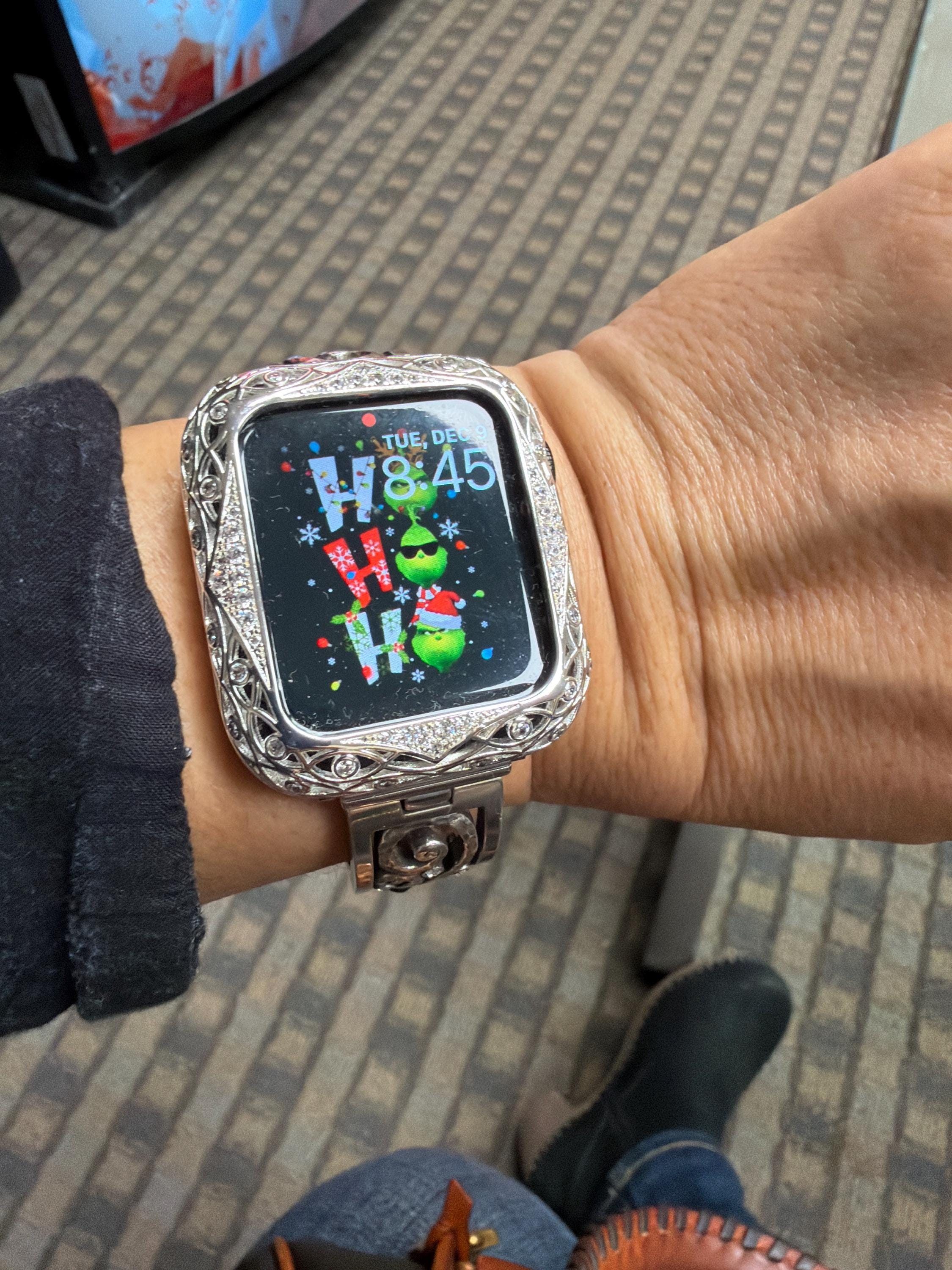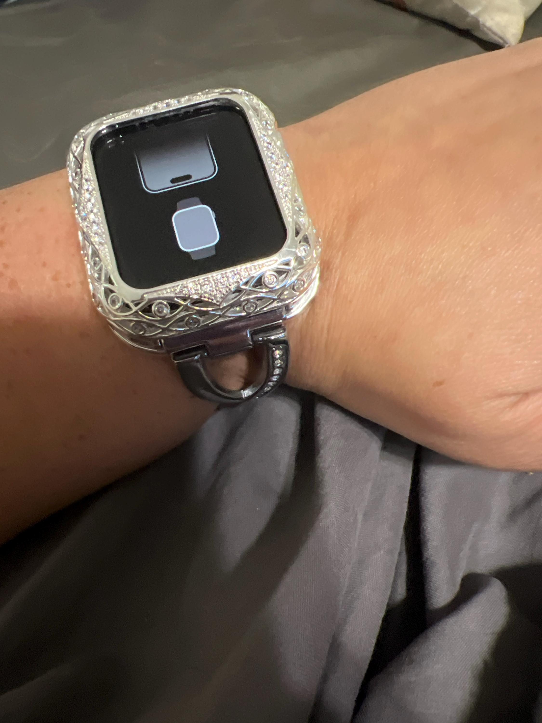 Transform your Apple Watch into a stunning piece of jewelry with our High End Swarovski Crystal Apple Watch Case Cover. Designed for sizes 38mm, 40mm, 41mm, 42mm, 44mm, 45mm, 46mm in Series 2-10 or SE for both men and women, this metal alloy plated bezel is the perfect accessory for your smartwatch. The secure inset is adorned with High End Crystals in a delicate lace design, making it a beautiful addition to any outfit.