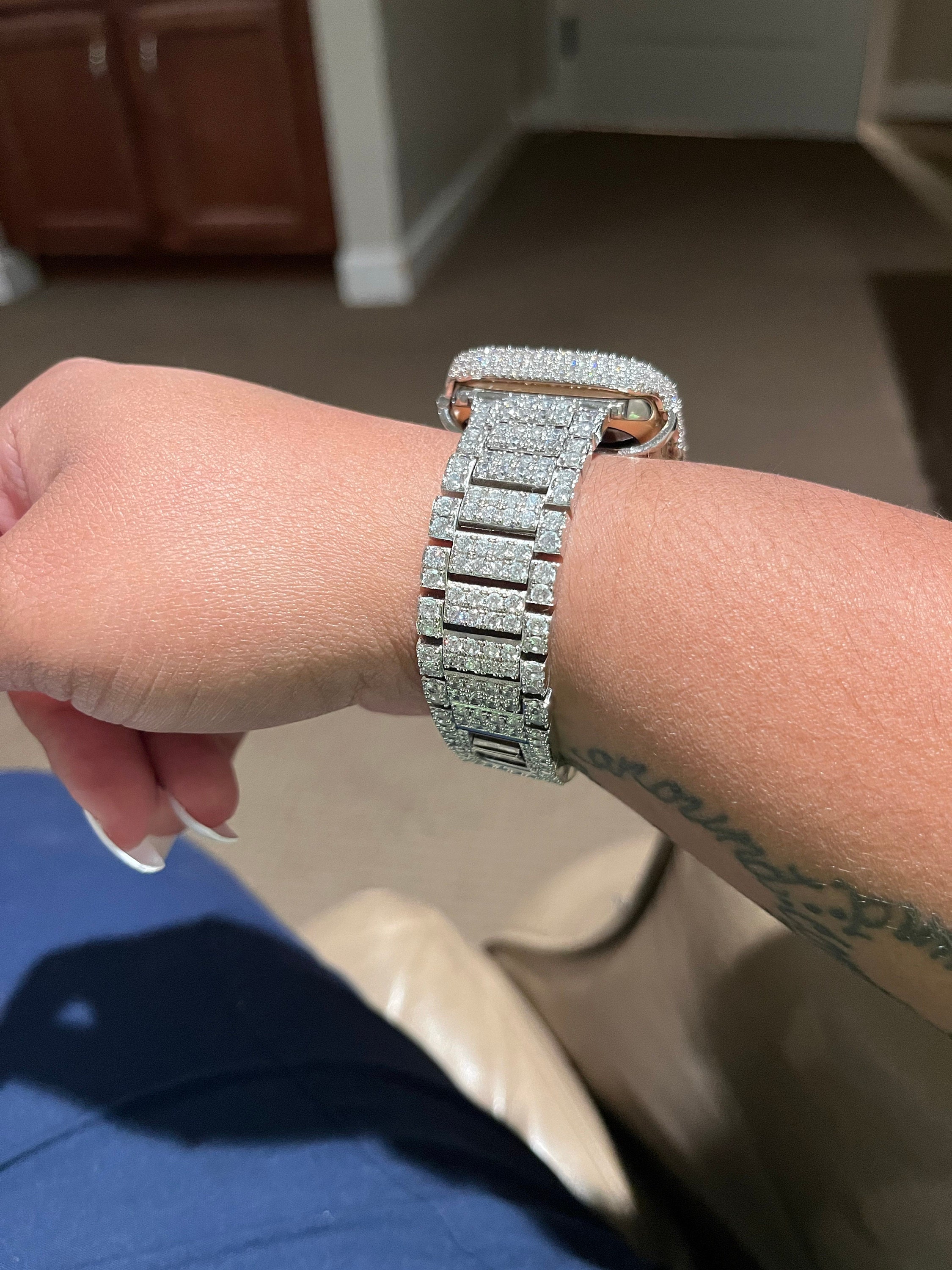 Fits the Apple Watch available for sizes 38,40,41, 42,44 and 45mm in series 1,2,3,4,5,6,7 or SE. Hand Made Custom Apple Watch Band With over 300 2mm Lab Diamond Stones hand set.